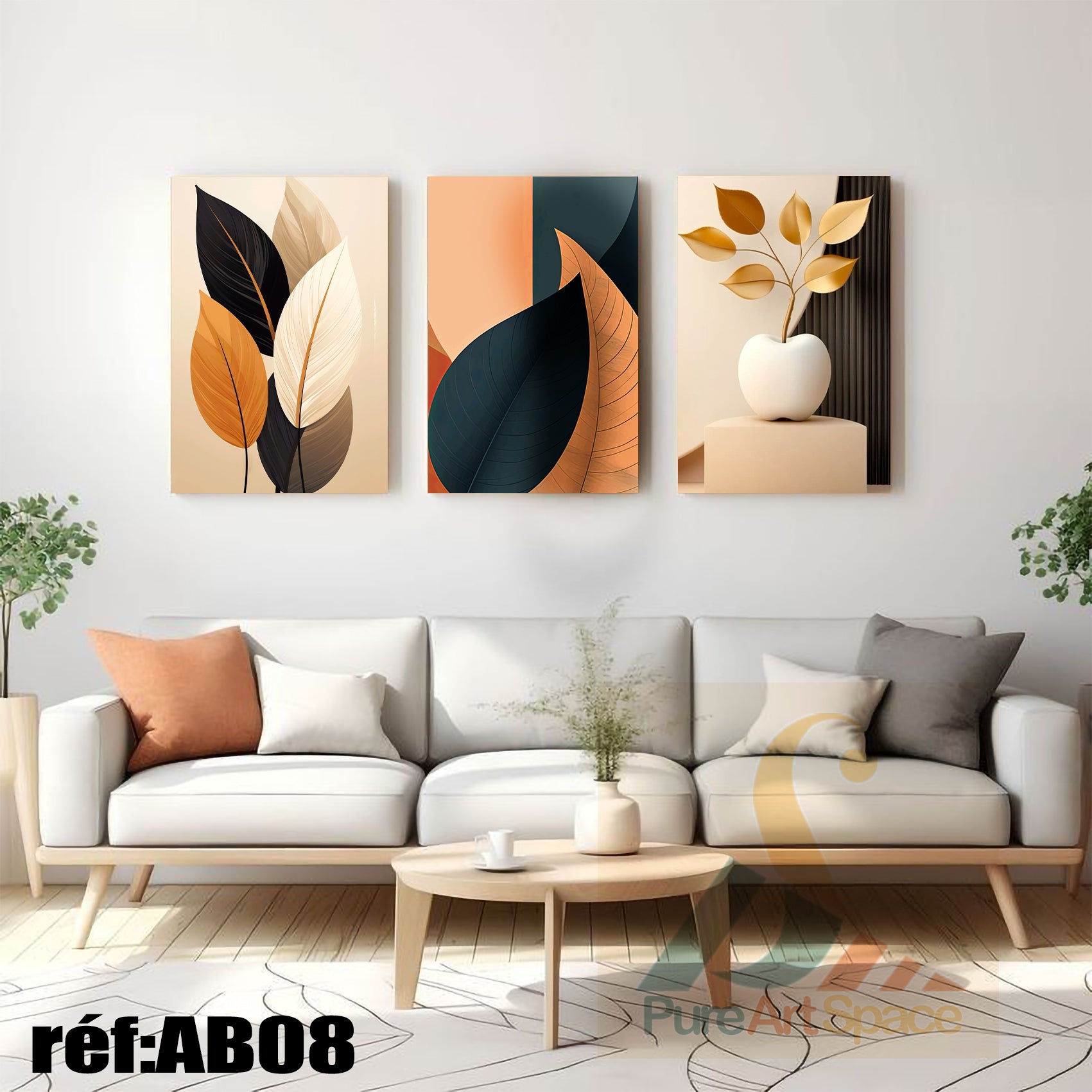 اللوحة اليمنى: تصميم راقٍ يصور غصنًا ذهبيًا في مزهرية بيضاء، يركز على التكوين الهندسي النظيف ويضيف لمسة من الفخامة التي تكمل المجموعة.