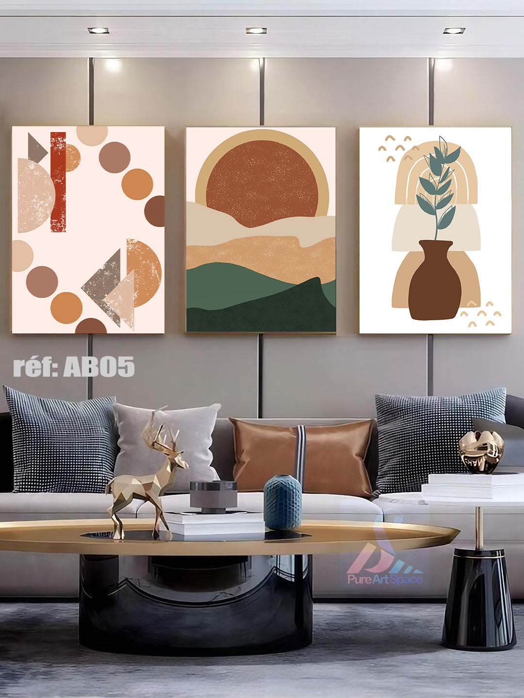 اللوحة الثانية (في المنتصف): تصميم هندسي تجريدي جريء يمزج بين الدوائر والمثلثات بألوان ترابية ومحايدة، يضيف عنصرًا من الحركة والتوازن البصري الحديث.