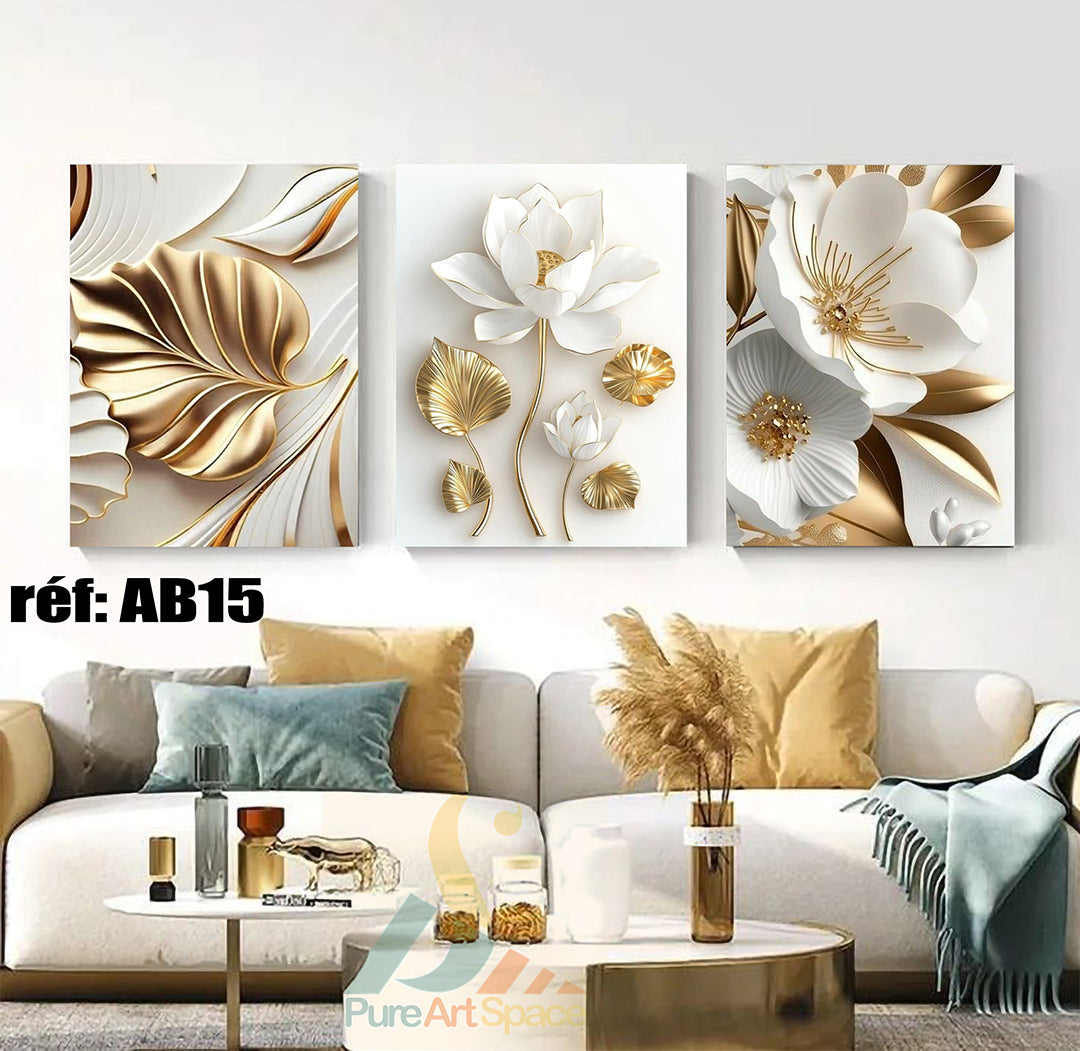 ارتقِ بديكور منزلك إلى مستوى جديد من الرقي والفخامة مع مجموعة اللوحات الجدارية "اللمسة الذهبية البيضاء" المكونة من 3 قطع. هذه اللوحات مصممة خصيصًا لتكون النقطة المحورية في أي غرفة، حيث تجمع بين جمالية الزهور البيضاء النقية وتألق اللمسات الذهبية تصميم يمنح إحساسًا بالعمق والحركة، مما يجعل الزهور والأوراق تبدو وكأنها منحوتات بارزة من الجدار.